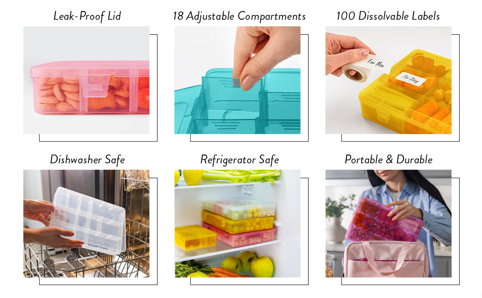 Now in a new large size, these parent-approved, BPA-free containers are made from safe, food-grade materials. With 18 adjustable compartments, they're perfect for organizing snacks, meals, and more at home, school, or on the go.
